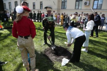 В ходе акции на территории академии было высажено три саженца из желудей дуба, посаженного императором Петром I в Летнем саду.