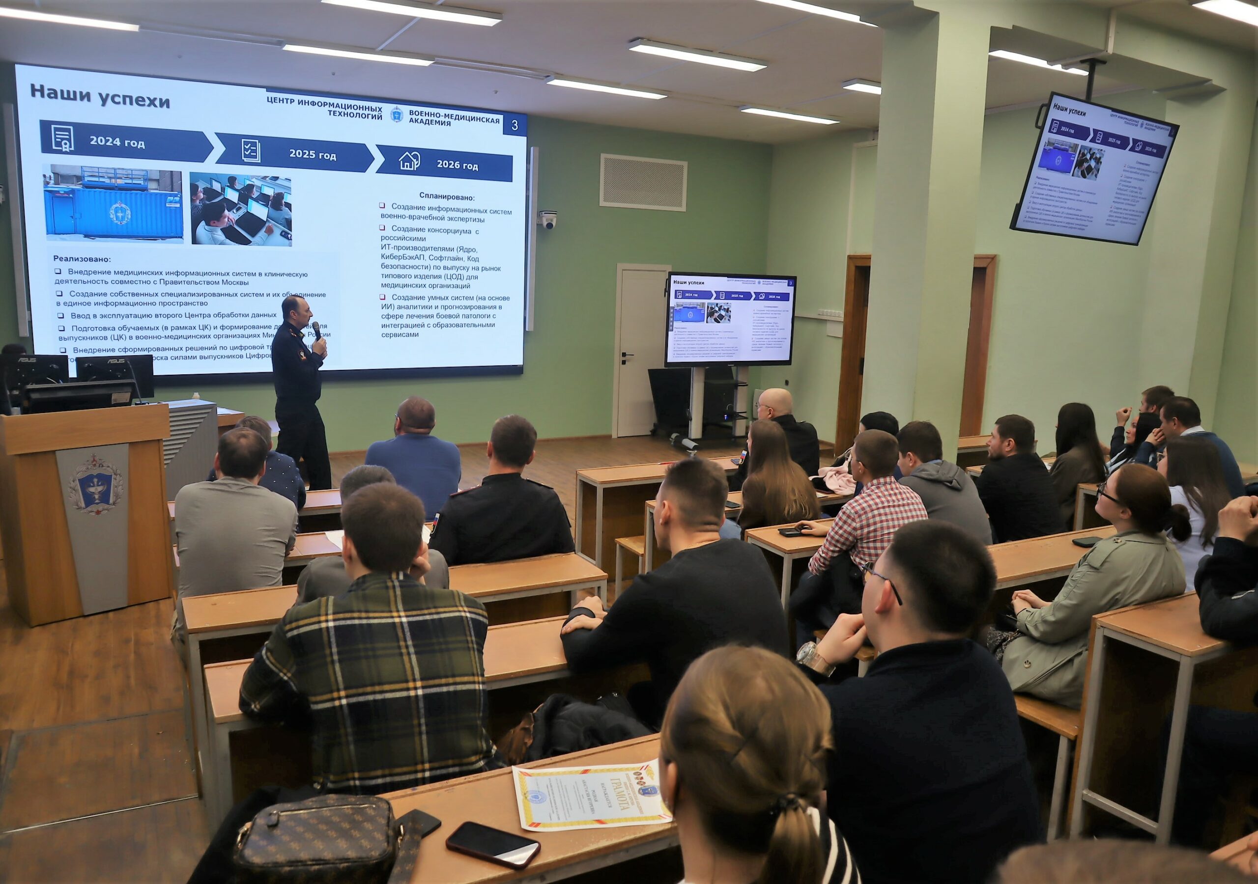 ЦИТ гордится тем, что в 2025 году удалось реализовать задачи, казавшиеся невыполнимыми: внедрить новую информационную систему в клиническую деятельность, создать собственные специализированные системы, ввести в эксплуатацию второй центр обработки данных, не имеющий аналогов в вузах страны, подготовить среди курсантов-медиков профессионалов с ИТ-компетенцией в рамках цифровой кафедры.