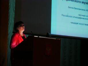 Белла Велихановна Абалаева, ведущий научный сотрудник Российского этнографического музея, в своем докладе рассказала курсантам об истории Российского этнографического музея. Он существует более ста лет и расположен в здании, специально построенном по проекту архитектора императорского двора В.Ф.Свиньина для показа этнографических коллекций. В центре музейного здания расположен Мраморный зал, облицованный розовым карельским мрамором – один из красивейших парадных залов Санкт-Петербурга. Белла Абалаева рассказала гостям, что в собрании музея около 700 тысяч единиц хранения, в том числе вещевые и иллюстративные памятники, фотодокументы и книги, архивные материалы по 158 многочисленным и малым народам России начиная с XVIII века.