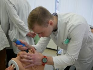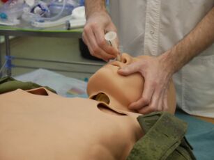 После теоретической части, заранее пройденной курсантами дистанционно, в течение полного учебного дня курсанты отработали навыки выявления и борьбы с жизнеугрожающими повреждениями (протокол «КАРТА»): К – кровотечение, А – асфиксия, Р – респираторные нарушения, Т – транспортная иммобилизация и температурный контроль, А – применение средств из индивидуальной аптечки. По каждому из этих вопросов была выделена отдельная учебная точка с тренажерами и манекенами. Дополнительно проводилось обучение технике сокращенного УЗИ при травмах и оценке острых неврологических нарушений.