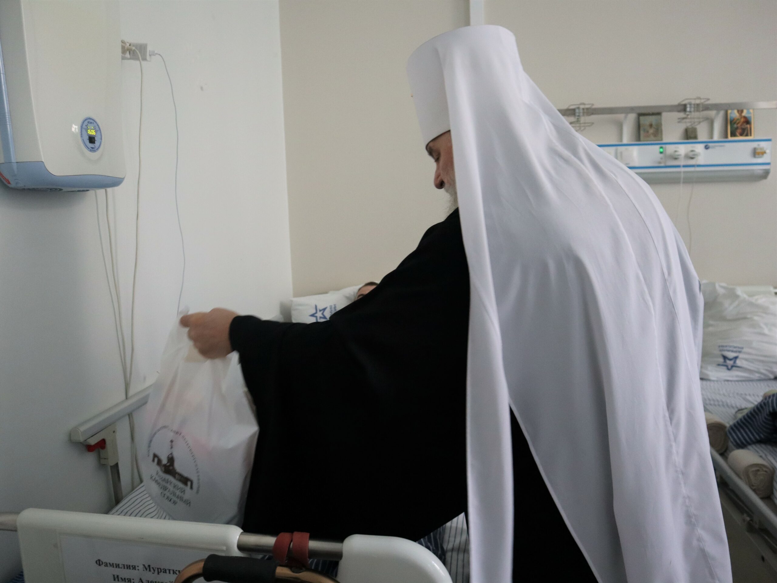 Владыка обошел палаты, поздравил раненых с праздником светлой Пасхи, вручил каждому пациенту подарок и пожелал скорейшего выздоровления. Православным воинам он подарил иконки и призвал не забывать дорогу в храм Божий.