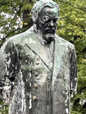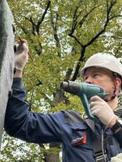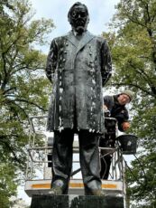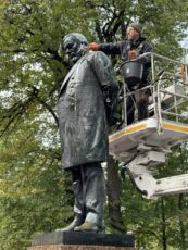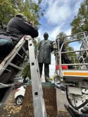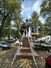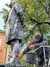 Второго октября у известного памятника Сергею Петровичу Боткину выдался банный день. Специалисты из Государственного музея городской скульптуры помыли монумент специальным раствором, а затем восстановили утраченную патину.
