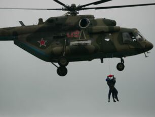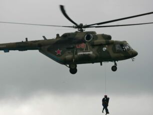 с поля боя воздушным транспортом – погрузка на вертолет МИ-8 в режиме зависания.