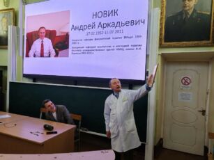 Перед собравшимися студентами, курсантами и преподавателями выступил музыкант, автор книги «Музыка как шанс» Влад Колчин. Он рассказал о перипетиях, с которыми он столкнулся, пытаясь вылечится от рассеянного склероза, пока наконец не встретил профессора А.А. Новика. В клинике Новика он прошел лечение трансплантацией аутологичных стволовых периферических клеток и практически выздоровел.