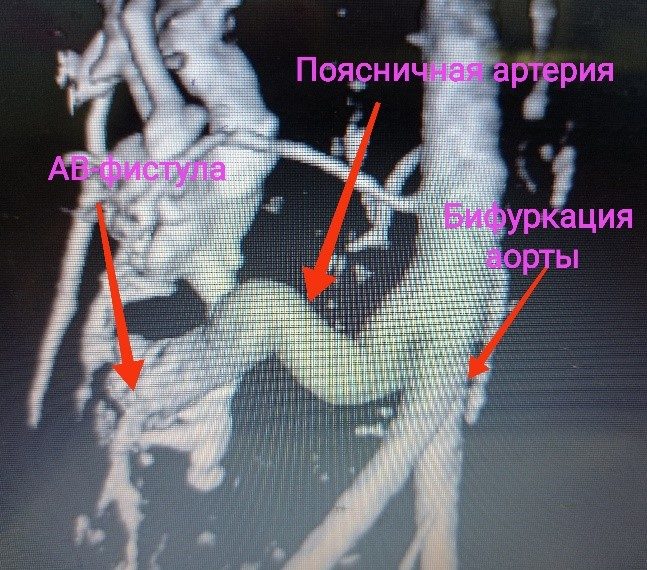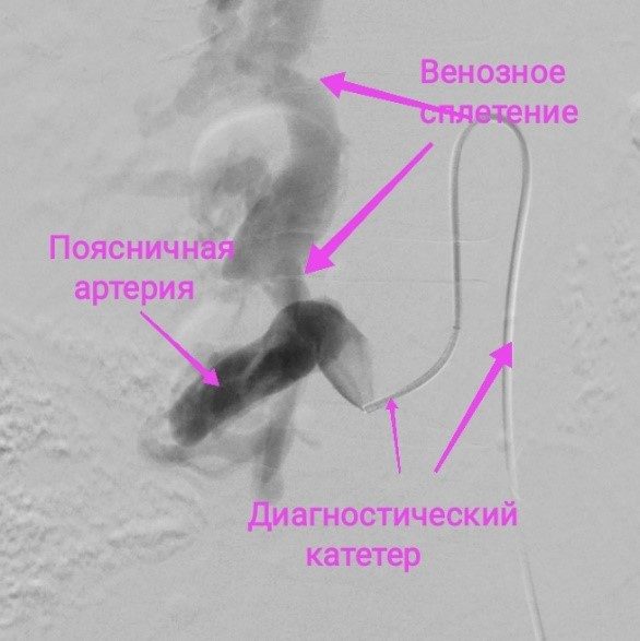 Под общей анестезией выполнена пункция правой бедренной артерии. Катетеризация артерии интродуктором 8F. Манипуляционным катетером SIM катетеризирована брюшная аорта, крупная (d=13 мм) поясничная ветвь справа, являющаяся источником спинальной фистулы, дренирующаяся в вены переднего и заднего внутренних венозных сплетений вплоть до правых камер сердца.