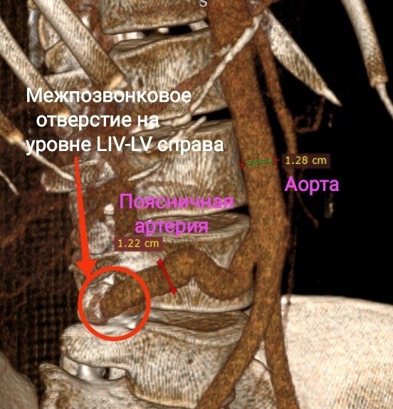Краткая информация о пациентке: в клинику обратилась молодая женщина, 2001 г.р. с жалобами на боль в поясничной области в течение последнего года. На представленных МРА, спинальной контрастной ангиографии в области правого межпозвонкового отверстия L4-L5 позвонков выявляется экстрадуральная артериовенозная фистула тип В1 (по классификации Clarke). На выполненной МСКТ-ангиографии живота на 25 мм выше уровня бифуркации аорты отходит поясничная артерия справа (просвет расширен до l2 мм), отдающая спинномозговую ветвь без уменьшения ее калибра, которая заходит в межпозвонковое отверстие L4-L5, сообщающаяся с венами переднего и заднего внутренних венозных сплетений, которые активно контрастируются в артериальную фазу сканирования. Отмечается расширение вен переднего и заднего внутренних венозных сплетений справа на уровне от Th10 (верхняя граница сканирования) до L5 позвонка справа, отмечается деформация тел L3-L4 позвонков по дорзальной поверхности справа (от давления). Вены сплетений дренируются через поясничные вены в нерасширенную правую восходящую поясничную вену. Прослеживаются расширенные артерии правой поясничной области (ветви дорзальной ветви правой поясничной артерии). С результатами проведенного обследования пациентка была консультирована в клинике нейрохирургии ВМедА, рекомендовано плановое внутрисосудистое лечение.