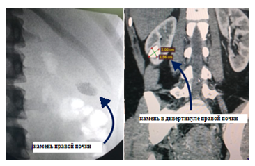 Краткая информация о пациенте: Пациентка А., 25 лет. Считает себя больной с 12-и лет, когда впервые была госпитализирована в городскую районную больницу с правосторонней почечной коликой. На момент обращения выявлен камень правой почки. В последующем отмечала периодические атаки пиелонефрита. При обследовании в 2018 г. по данным УЗИ выявлен дивертикул чашечки, камень правой почки диаметром около 2 см. Госпитализирована в клинику урологии для оперативного лечения.