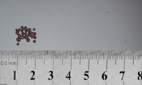 Краткое описание хода операции: Под рентгеновским контролем пунктирована средняя задняя чашка правой почки, получена моча. Проводник проведен в чашку. Нефростомический ход поэтапно бужирован. В дивертикул чашечки почки установлен тубус мининефроскопа 17,5 Сh. Выполнена дивертикулоскопия – визуализированы множественные мелкие камни чашки. Камни поэтапно удалены с помощью эндоскопических щипцов и частично отмыты. В связи со снижением эндоскопической видимости (гематурия) принято решение о завершении операции. Ретроградно по мочеточниковому катетеру через среднюю заднюю чашку и далее наружу через нефростомический ход проведен проводник, по которому установлен нефростомический дренаж. Эвакуированные камни дивертикула средней задней чашки правой почки около 50 шт. диаметром 1-2 мм. Через 2 недели состоялся второй этап перкутанной нефролитолапаксии справа, в ходе которого были удалены с помощью эндоскопических щипцов и частично отмыты оставшиеся камни средней задней чашки правой почки, около 15 шт. Установлен внутренний мочеточниковый стент справа проксимальным концом в ложе дивертикула.