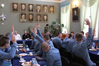 В.А. Швец, обращаясь к молодым людям напомнил, что в России испокон веков уважают ратный труд, меняются оружие и боевая техника, неизменными остаются любовь и преданность настоящего солдата к своему Отечеству, верность присяге и воинскому долгу, честь и достоинство.