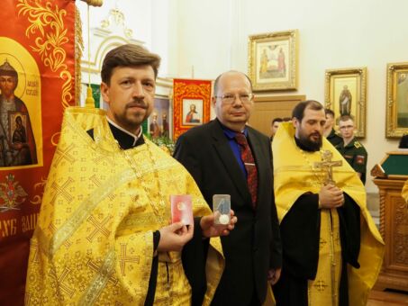 В этот торжественный день, после Литургии, президентом фонда св. мученика Вонифатия Наталией Сергеевной Мезенцевой, в рамках программы «Духовное укрепление российского воинства», были переданы иконы с частицами мощей св. князя Андрея Боголюбского, св. князя Димитрия Донского, копия мироточивой иконы Божией Матери «Умягчение злых сердец» с частицей покрова Пресвятой Богородицы, а также флаг с изображением нерукотворного образа Спасителя, освещённый у Гроба Господня, для врачей и воинства российского. Отец Андрей выразил искренние слова благодарности от лица командования и духовенства за заботу и попечение о храмах Военно-медицинской академии: «Сегодня престольный праздник нашего храма, и в этот радостный и светлый день Господь нас укрепил и благословил: благодаря усердию, вере и духовному энтузиазму неравнодушных людей в наш академический приход передаются великие для верующего сердца святыни».