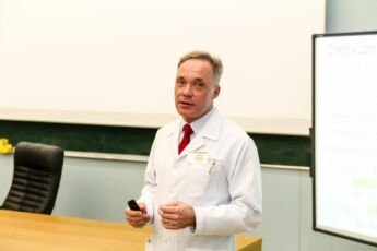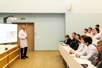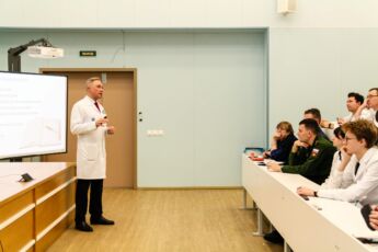 Начальник кафедры Владимир Салухов не только прочел курсантам лекцию об основных принципах обучения и развития в академии и медицине, но и поделился личными историями о построении карьеры врача и ученого