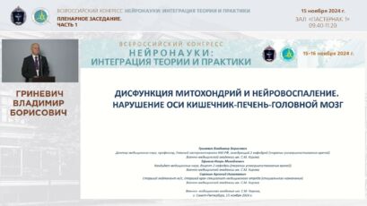 Пленарное заседание было открыто докладом академика РАН Сергея Иллариошкина, посвященным исследованию метаболической пластичности мозга при нейродегенеративных заболеваниях и продолжилось докладом доктора медицинских наук, профессора Игоря Литвиненко, в котором были представлены возможности стратегии поддержания церебрального резерва при нейродегенеративных заболеваниях и травматических повреждениях мозга. Затем выступил доктор медицинских наук, заведующий кафедры ТУВ 2 Военно-медицинской академии, профессор, Владимир Борисович Гриневич в своем докладе осветил патогенез коморбидной проблемы – дисфункции митохондрий и нейровоспаления при нарушении оси кишечник-печень-головной мозг.