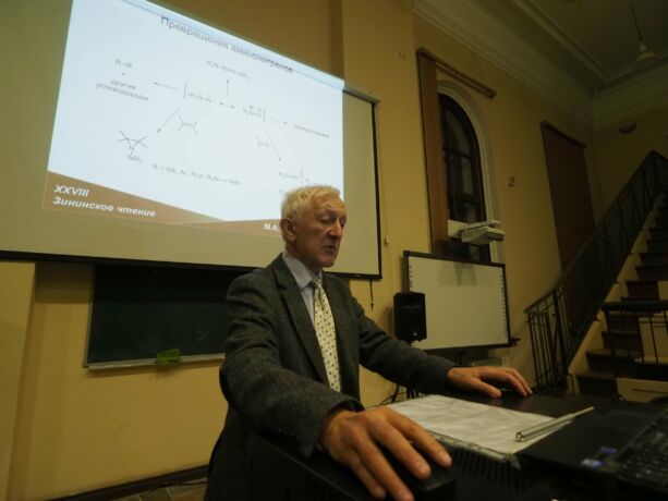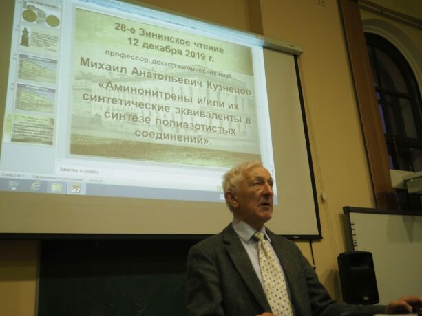 12 декабря 2019 года состоялись XXVIII Зининские чтения, которые ежегодно проводятся в 11 исторической (Зининской) аудитории Естественно-исторического института Военно-медицинской академии. Проводит Зининские чтения кафедра химии ВМедА и Санкт-Петрбургское отделение российского химического общества имени Д.И. Менделеева. В этом году в качестве основного докладчика, так называемого «Зининского чтеца», выступал доктор химических наук, профессор, заведующий кафедрой органической химии СПбГУ Михаил Анатольевич Кузнецов. Его доклад назывался «Аминонитрены и/или их синтетические эквиваленты в синтезе полиазотистых соединений». Наряду с ведущими учёными-профессорами СПб в области органической химии, представителями СПбГУ, Педагогического университета, Технологического университета, ИВС РАН и др. – В.А.Островским, А.В.Васильевым, С.В.Макаренко, А.В.Догадиной, А.В.Теньковцевым и многими другими, а также студентами этих вузов на чтениях традиционно присутствовали курсанты 1 и 2 курсов 2 и 4 факультетов нашей академии. По окончании лекции и ответов на многочисленные вопросы Михаил Анатольевич Кузнецов был награждён дипломом Зининского чтеца и памятной медалью.