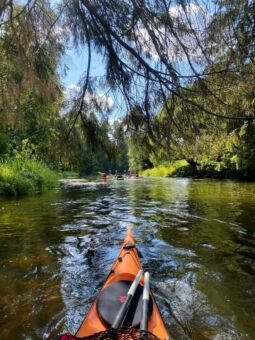 На протяжении всего маршрута, составившего 20 километров, участники турклуба преодолевали извивающиеся потоки реки, осваивали навыки маневрирования и уверенно обходили препятствия на каяках.