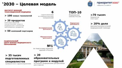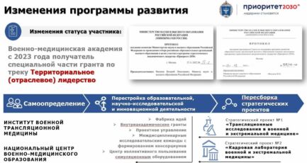 В своём докладе Руслан Макиев подчеркнул, что всё цели и показатели, поставленные перед академией в рамках стратегического планирования за 2021-2022 год были достигнуты. Однако современные реалии заставили проектную команду «Приоритета 2030» в составе заместителя начальника академии по учебной работе полковника медицинской службы Руслана Макиева, заместителя начальника академии по научной работе полковника медицинской службы Евгения Ивченко и начальника отдела медицинских информационных систем Центра координации медицинского обеспечения МО РФ подполковника медицинской службы Олега Гаспаряна ,под руководством начальника Военно-медицинской академии генерал-лейтенанта медицинской службы Евгения Крюкова внести некоторые изменения в концепцию развития вуза. В ходе проведения специальной военной операции выяснилось, что гражданское здравоохранение утратило многие знания и навыки, необходимые для качественного оказания врачебной помощи раненым и пострадавшим на поле боя и Военно-медицинская академия готова стать флагманом для внедрения умений военных медиков во всю систему Министерства здравоохранения. Для этого была проведена переборка стратегических проектов, которые позволили чётко сформулировать целевую модель по формированию Института военной трансляционной медицины Национального центра военно-медицинского образования.