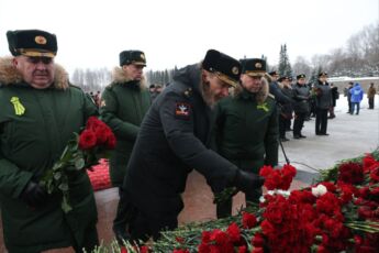 Начальник академии генерал-лейтенант медицинской службы Евгений Крюков прошел к монументу Мать-родина в коробке Ленинградского военного округа и возложил цветы к памятнику погибшим ленинградцам.