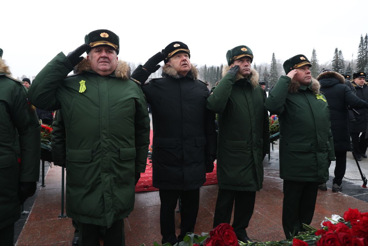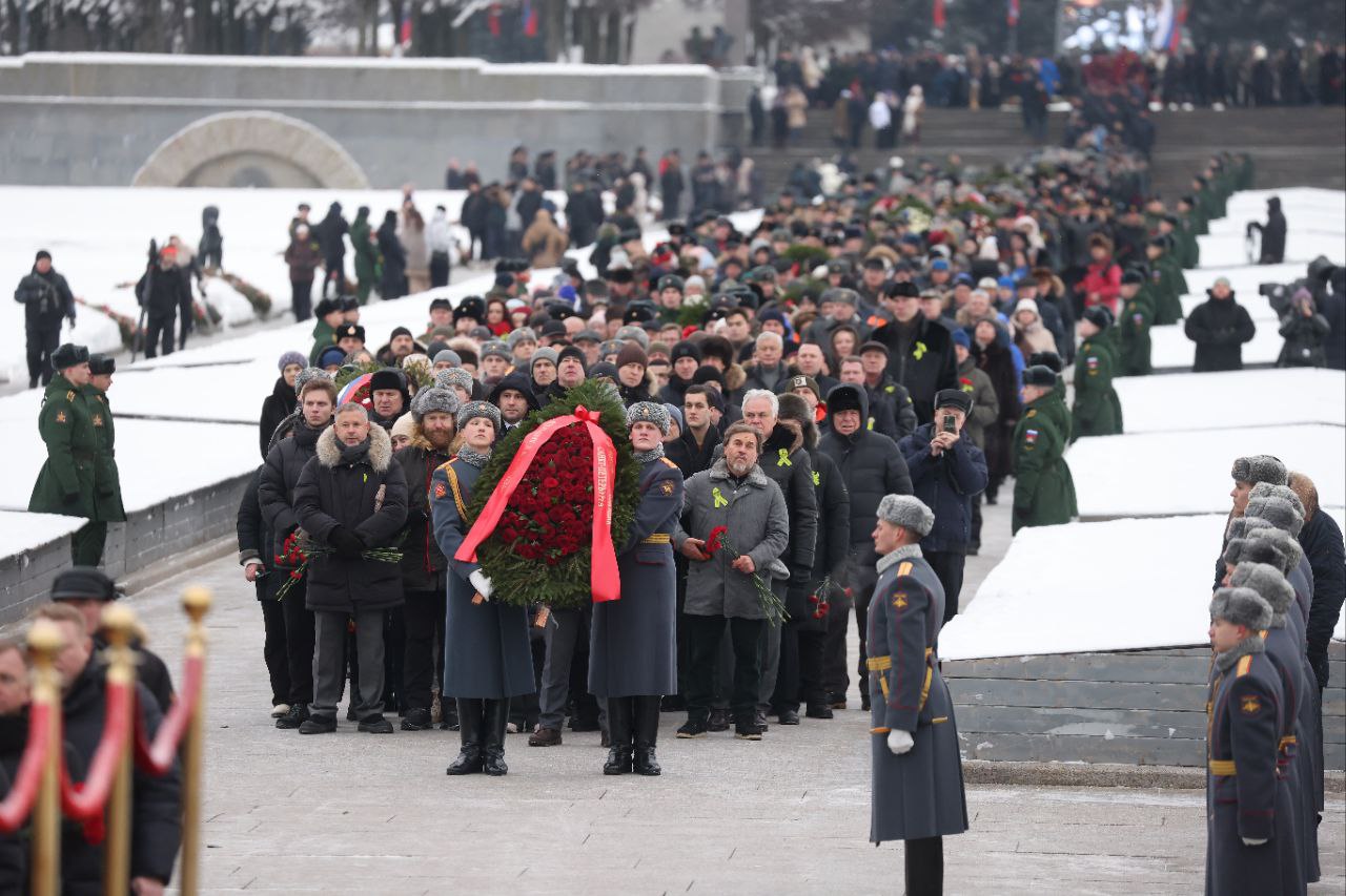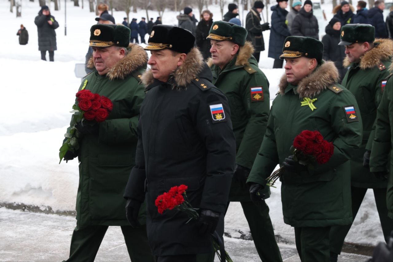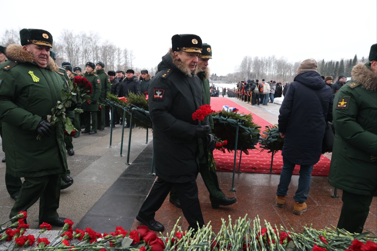 Начальник академии генерал-лейтенант медицинской службы Евгений Крюков прошел к монументу Мать-родина в коробке Ленинградского военного округа и возложил цветы к памятнику погибшим ленинградцам.
