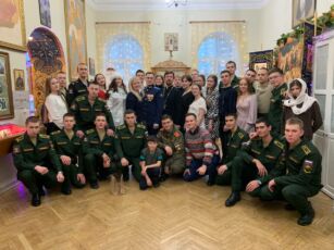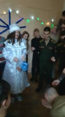 В гости к курсантам и прихожанам пришли сказочные персонажи, дедушка Мороз и Снегурочка, которых сыграли ребята, которые часто приходят в храм.
