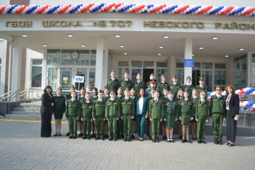Справочно: Обучение в военно-медицинском кадетском классе прививает ребятам навыки оказания первой медицинской помощи и знания о том, как действовать в чрезвычайных ситуациях, а также усердие и дисциплину, которые необходимы врачам. 16 февраля 2024 г. в школе №707 Невского района состоялось торжественное посвящение в кадеты учеников военно-медицинского класса. Всего, клятву кадета произнесли 30 школьников. Кадетам были вручены шевроны со специально разработанной для них эмблемой, которую они могут использовать для шеврона, размещения на полотнище флага кадетского класса и на лацканном знаке. Ее разработали специалисты военно-медицинской академии и военно-геральдической службы ВС РФ.