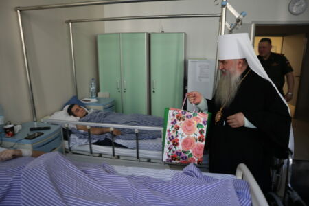 Митрополит Санкт-Петербургский и Ладожский постоянно посещает раненых, поддерживая их словом и подарками.