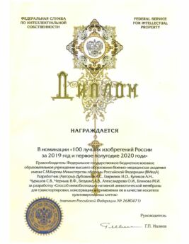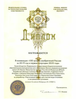 В июне 2020 года Роспатент объявил победителей в номинации «100 лучших изобретений России за 2019 год и первое полугодие 2020 года». Разработки ученых Военно-медицинской академии получили высокие оценки экспертной комиссии конкурса. Дипломом Федерального института промышленной собственности награждены: