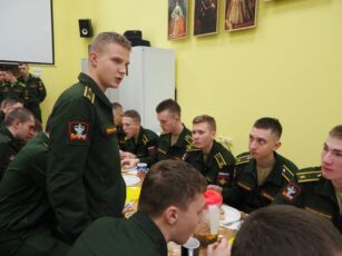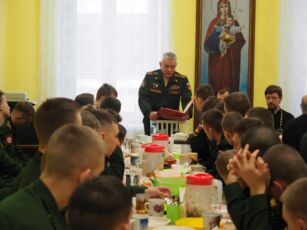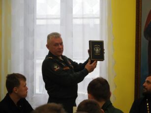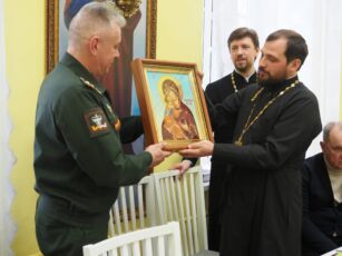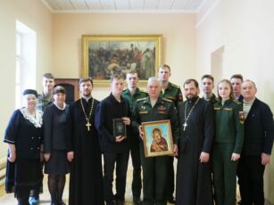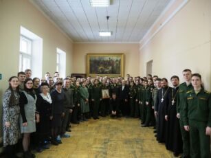 В заключении настоятель храма святых первоверховных апостолов Петра и Павла иерей Андрей Ващенко вместе с иереем Феодором, поблагодарили Владимира Лютова за доклад и подарили в честь наступающего праздника Дня защитника Отечества икону Божией Матери. А также поблагодарили всех присутствующих за совместную молитву и пожелали курсантам нести свое звание с поднятой головой.