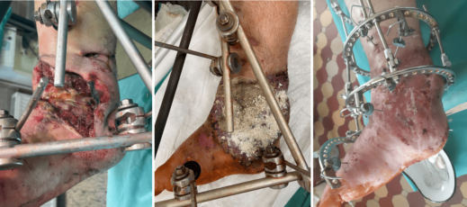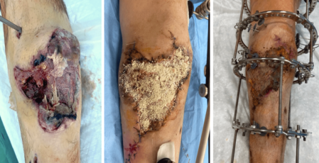 Группа исследователей –клиницистов академии под руководством Хоминца Владимира Васильевича, профессора кафедры военной травматологии и ортопедии, исследуют эффективность применения изготовленных продуктов из пуповины человека у пациентов с глубокими повреждениями кожи. На фото видно, как материал из бесклеточного матрикса помогает пациентам регенерировать собственные клетки.