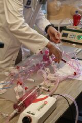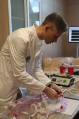 Технология временной экстракорпоральной перфузии, разработанная группой специалистов во главе с заместителем начальника кафедры и клиники военно-полевой хирургии Виктором Ревой, является жизне– и органосохраняющей и позволяет поддерживать или восстановить кровоснабжение (перфузию) всего организма в целом или отдельного ее сегмента. Перфузия конечности выполняется при выраженной ее ишемии (длительном кислородном голодании) и риске ампутации либо при полной травматической ампутации конечности. Для быстрого восстановления кровоснабжения венозную кровь насыщают кислородом с помощью ЭКМО и перенаправляют в артериальное русло, устанавливая при этом канюлю в любой наиболее удобный артериальный сосуд. В таком виде пострадавший может быть, как транспортирован на этап специализированной хирургической помощи, так и прооперирован на данном этапе при наличии возможности и благоприятной медико-тактической обстановке. Виктор Рева отмечает: «Данная технология была успешно апробирована в зоне СВО как для спасения жизни пациентов, находящихся в состоянии клинической смерти, так и для спасения конечностей. Все конечности благодаря этой методике удалось сохранить.»