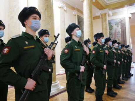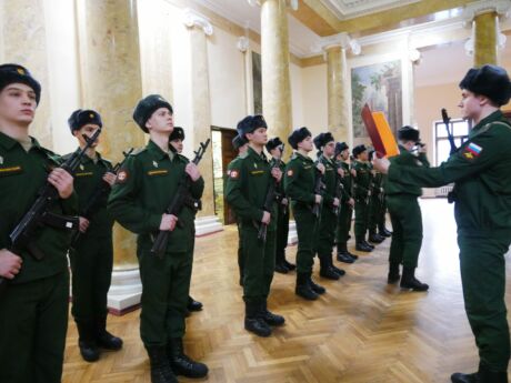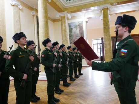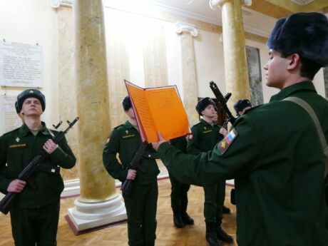 Справочно. Военная присяга – торжественное обещание, клятва, которую дает гражданин, вступающий в ряды Вооружённых Сил. Присягая на верность Отечеству, молодые люди берут на себя высокие обязательства: “свято соблюдать Конституцию Российской Федерации, строго выполнять требования воинских уставов, приказы командиров и начальников. Солдаты клянутся достойно исполнять воинский долг, мужественно защищать свободу, независимость и конституционный строй России, народ и Отечество”.