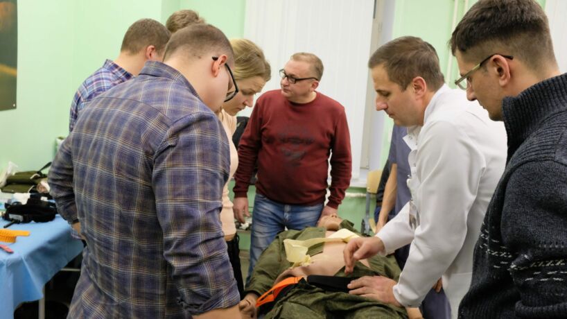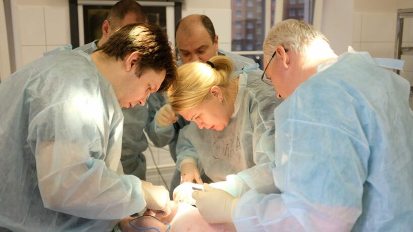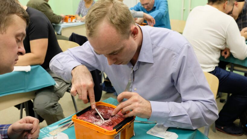 В ходе основной части курса 20 гражданских и военных хирургов под руководством преподавателей одновременно на 5 операционных столах выполняли наиболее важные жизнеспасительные оперативные вмешательства при травмах и ранениях шеи, груди, живота, таза, конечностей. Были отработаны такие операции, как доступы к магистральным сосудам шеи и конечностей, шов и временное протезирование магистральных артерий, внешняя фиксация переломов и фасциотомия, внебрюшинная тампонада таза, лапаротомия и ревизия аорты и нижней полой вены, удаление почки и селезенки, шов и тампонада печени, торако- и стернотомия, резекция и удаление легкого, фенестрация перикарда, шов раны сердца, эндоваскулярная баллонная окклюзия аорты и многие другие. Кроме того, были отработаны базовые навыки догоспитальной помощи раненым: устранение асфиксии путем конико- и трахеотомии, применение местных гемостатических средств для остановки кровотечения, внутрикостный доступ для проведения инфузий – все то, что определяет исход в первые минуты после получения травмы или ранения.