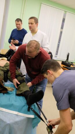 В Симуляционном центре состоялся и базовый курс по сосудистым повреждениям. Участники отрабатывали навыки бокового и циркулярного сосудистого шва, пластики заплатой, шунтирования сосуда и временного протезирования на высокореалистичных симуляторах, которые были разработаны специалистом кафедры военно-полевой хирургии Ю.А. Лошенко.  Такие симуляторы позволяют поддерживать кровоток по имитатору крупного кровеносного сосуда.