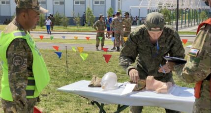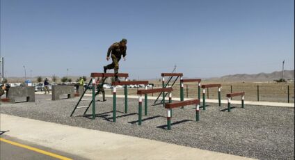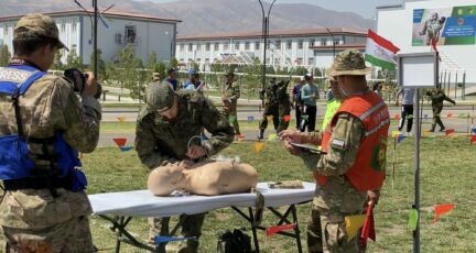 Российские военные медики, участвующие в конкурсе полевой выучки «Военно-медицинская эстафета» Армейских международных игр-2021 прошли полосу препятствий, а также показали специальные навыки на полигоне Фориш (Республика Узбекистан).